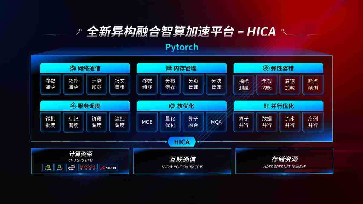 通过自研的服务层、、、中间适配层、、、以及调度编排算法,,采用数据并行、、、模型并行等多种并行方式,,,把并行计算任务进行有效的分解,,使其分别由相应的软件栈和算力资源来承接。。当GPU资源变化,,,HICA可以实时动态调度计算子任务并调整模型拓扑和架构,,,,以充分聚合各种算力资源。。。