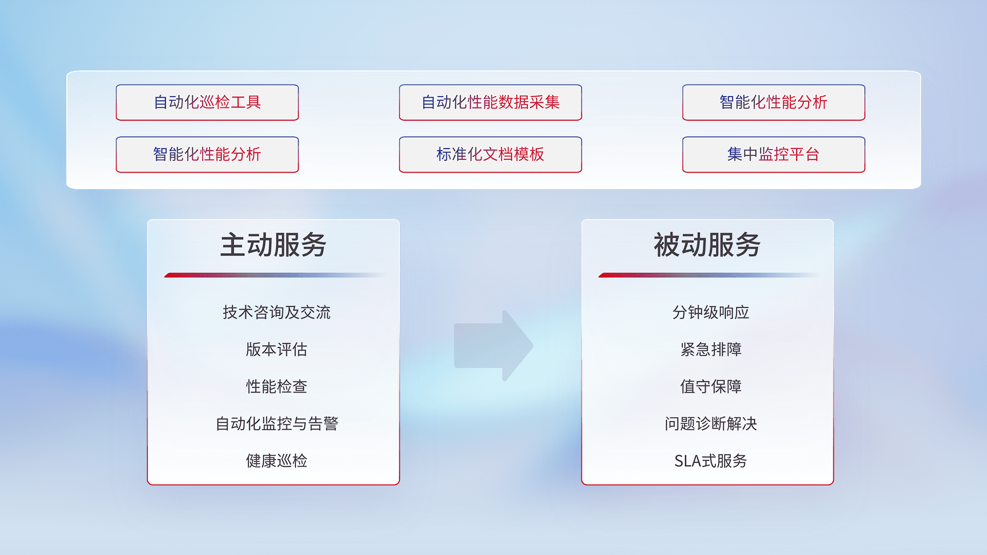 智能化工具和标准化文档,,,,保障服务质量,,提供主动服务(包含技术咨询、、、版本评估、、、、性能检查、、、、自动化监控与告警、、健康巡检)和被动服务包含(分钟级响应、、紧急排障、、、、值守保障、、、问题诊断解决、、SLA服务)。。。。